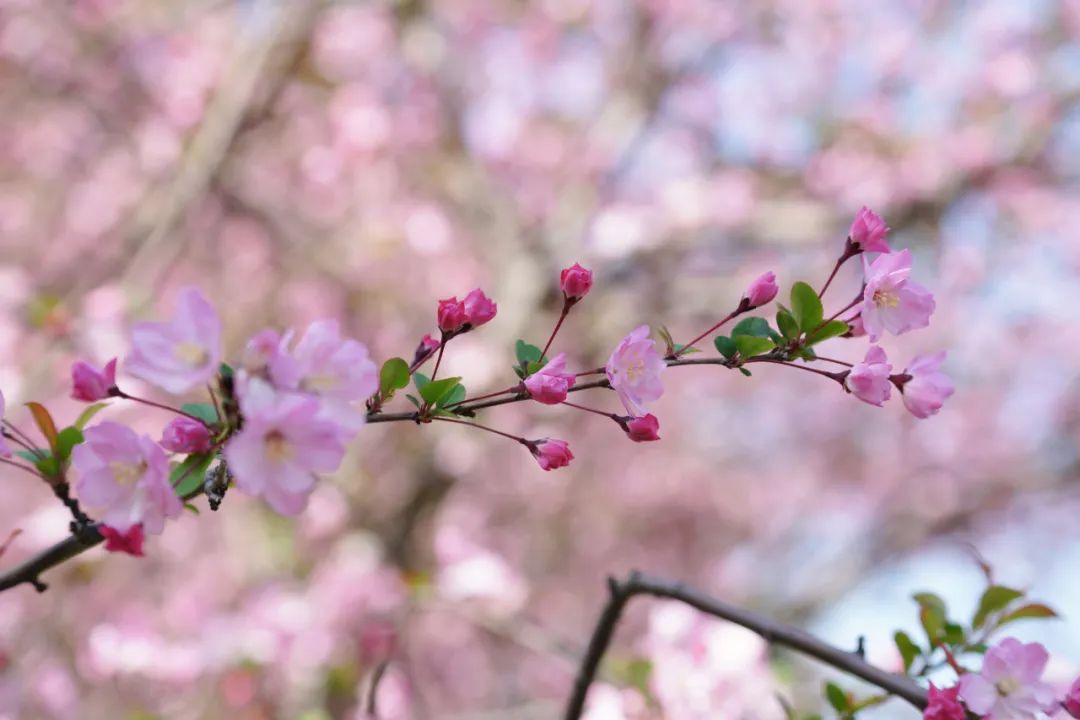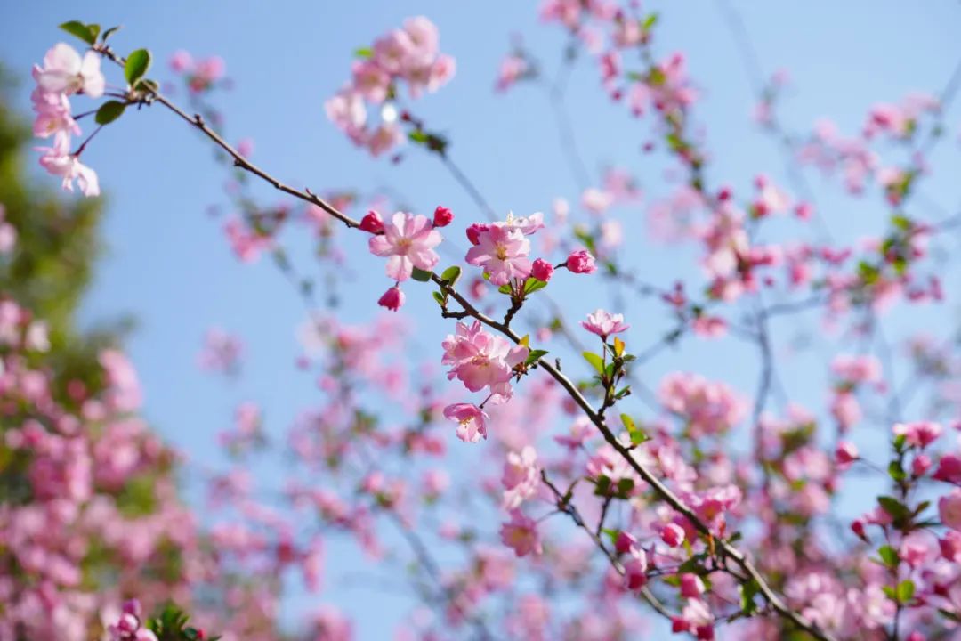 除樱花外,沁园湖的垂丝海棠也已绽放,它们的花朵像胭脂一样红润,为这个春天增添了更多的浪漫感,使这里的春色更加迷人。