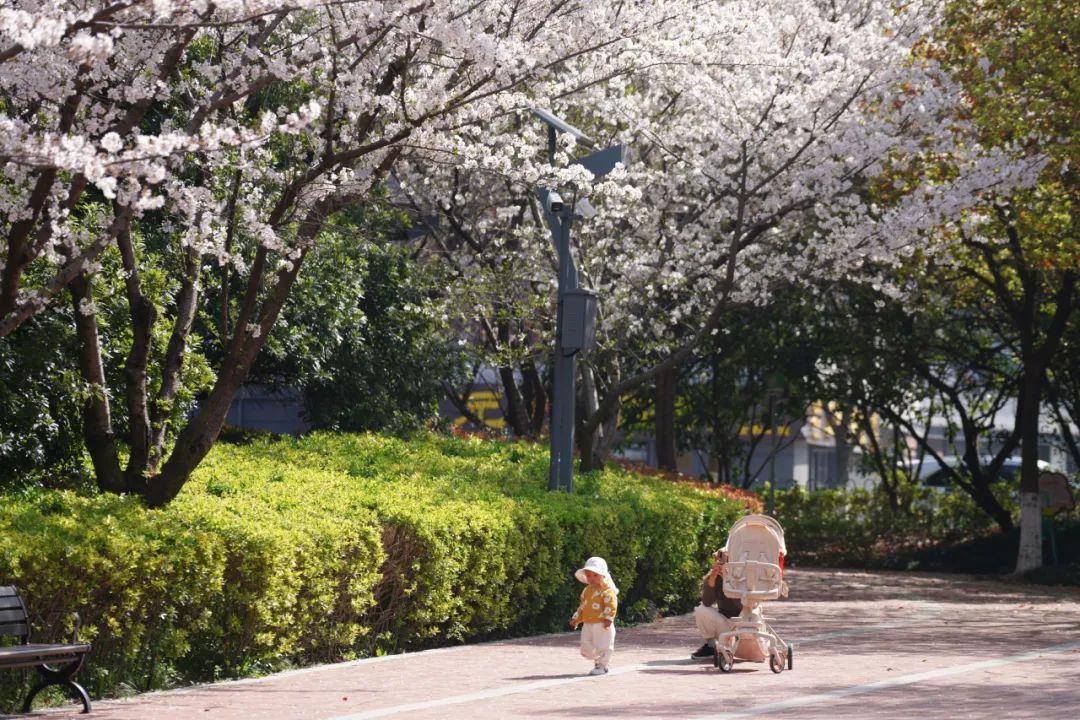 在沁园湖绿地广场,樱花的主要品种是染井吉野樱花,它们在3月下旬迎来了最佳的欣赏阶段。当你走在这个公园里,你可以抬头看到层层叠叠的樱花。微风轻轻吹过,樱花的花瓣纷纷飘落,为今年春天增添了独特的浪漫。