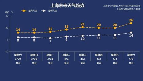 周末气温还是不高,保持在8~14℃之间。幸运的是,阳光回归,风速降低,体验更舒适。洗涤和干燥可以重新安排。下周,上海将是阴天,充满春天。周初,气温仍然很低,在7~9℃之间,白天气温开始上升。下周中期气温保持在9~21℃的舒适区,清明节假期气温会进一步升高。