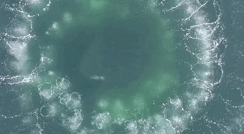 当座头鲸发现鱼或虾时,它会悄悄地来到狩猎下面,一边转身一边喷出密密麻麻的气泡。气泡上升时会形成“院墙”,里面会有狩猎圈。然后座头鲸只需要张开嘴,穿过“院墙”,食物就会进入嘴里。