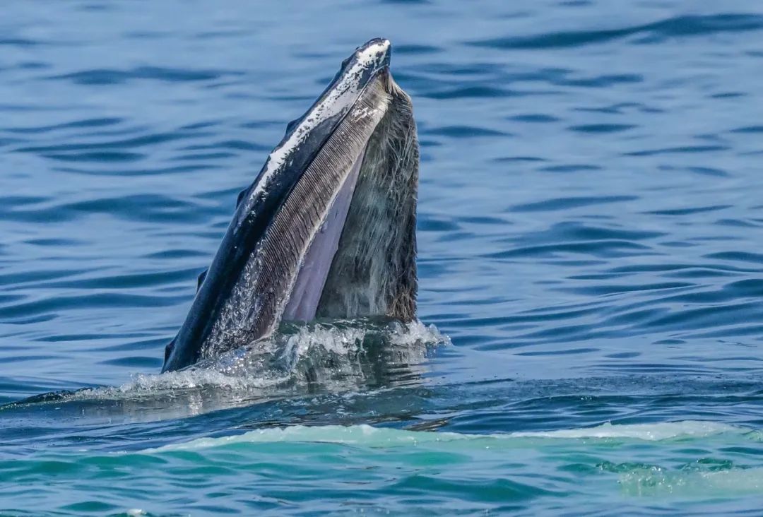 当座头鲸张开嘴时,我们也会发现里面没有牙齿,而是形状像梳子的鲸须板。鲸须板是从座头鲸上颌延伸而来的角蛋白结构,起到过滤作用。吃饭的时候,座头鲸会把海水和小鱼小虾一起吞进嘴里,然后海水是通过鲸须板排出的,只剩下食物。