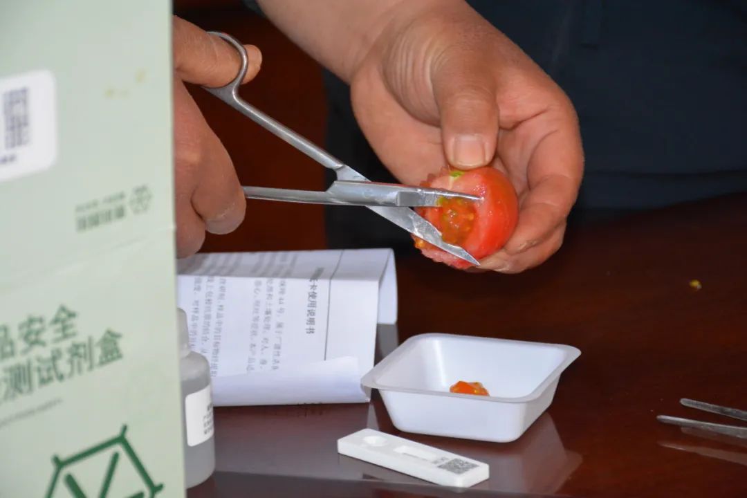 取出一个西红柿,切成块,经过几分钟的快速检测,5分钟就能检测出农药残留,扫描二维码就能知道它的“前世”...近日,河北省沧州市献县农业农村局和献县蔬菜产业协会正式启动“献县蔬菜” 地面自检“质量提升工程”。在省、市、县三级农产品质量安全监督机构的指导下,该项目将胶体金精确速测技术引入田间地头,将农产品质量安全控制延伸到生产根源,为蔬菜上市设置“安全锁”。