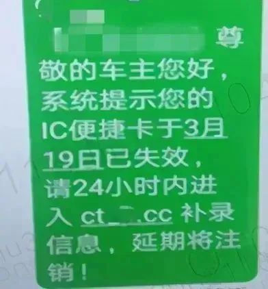 骗子冒充ETC中心、高速管理处、交通管理12123等机构,通过短信向居民发送“ETC暂停停用,需要重新验证”的虚假短信。
