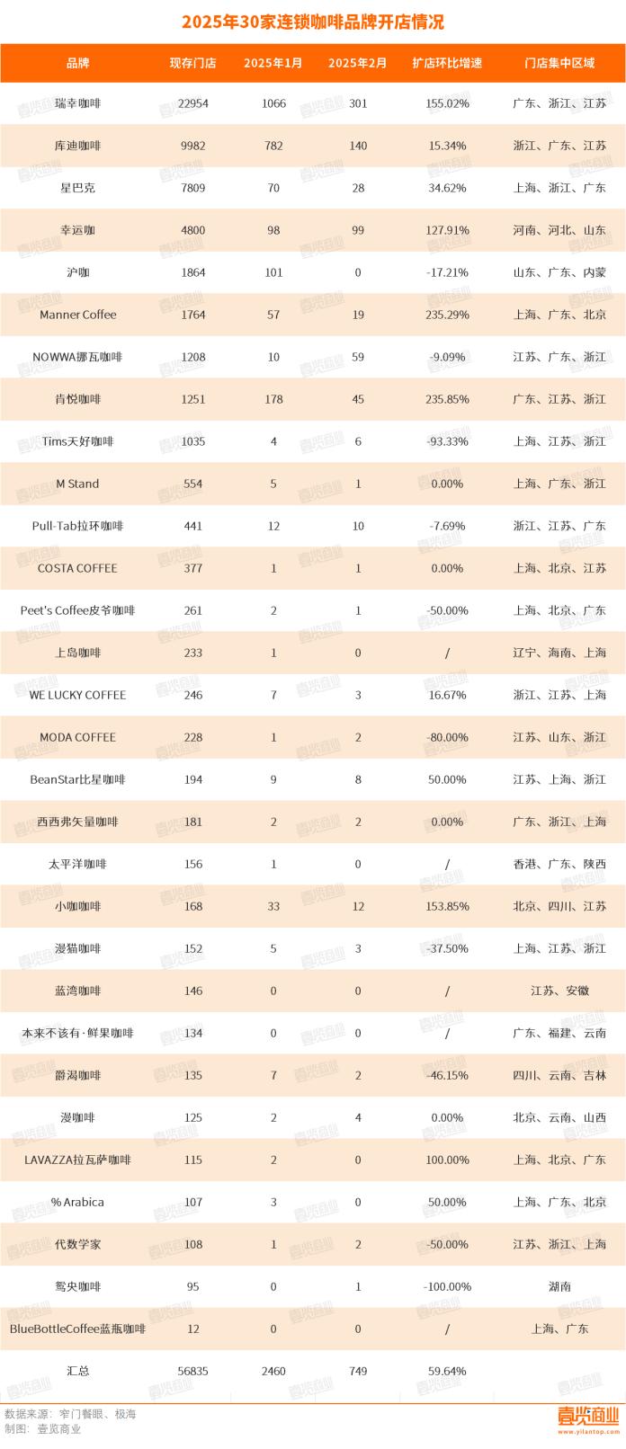 二月份,壹览商业长期跟踪的30家连锁咖啡品牌新开店749家,比上年同期下降72.40%,比上年同期下降30.26%,店面总数达到56835家。在这些店铺中,瑞幸以22954家店铺排名第一,库迪咖啡店数量减少,9982家,排名行业第二,星巴克以7809家店铺排名第三。