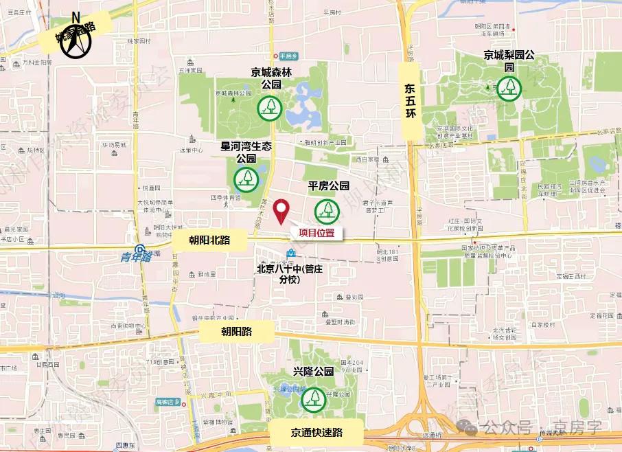 从这么长的地块名称可以看出,这是两个不在同一区域的地块。其中,住宅部分存在于平房乡黄杉木店的地块中。该地块位于东五环,朝阳北路北侧,朝阳流行的朝青板块。新地块的西北是前几年著名的豪宅星河湾和星河湾生态公园。朝阳北路位于南侧,朝阳大悦城位于西侧。周围有许多青年路站地铁6号线,但距青年路站1公里以上的直线距离。