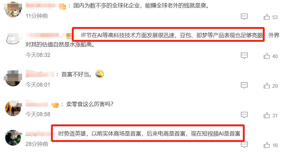 “字节在AI等高科技技术方面发展迅速,豆包、即梦等待商品的表现也足够明亮,外界对其的估值自然是节节攀升。”