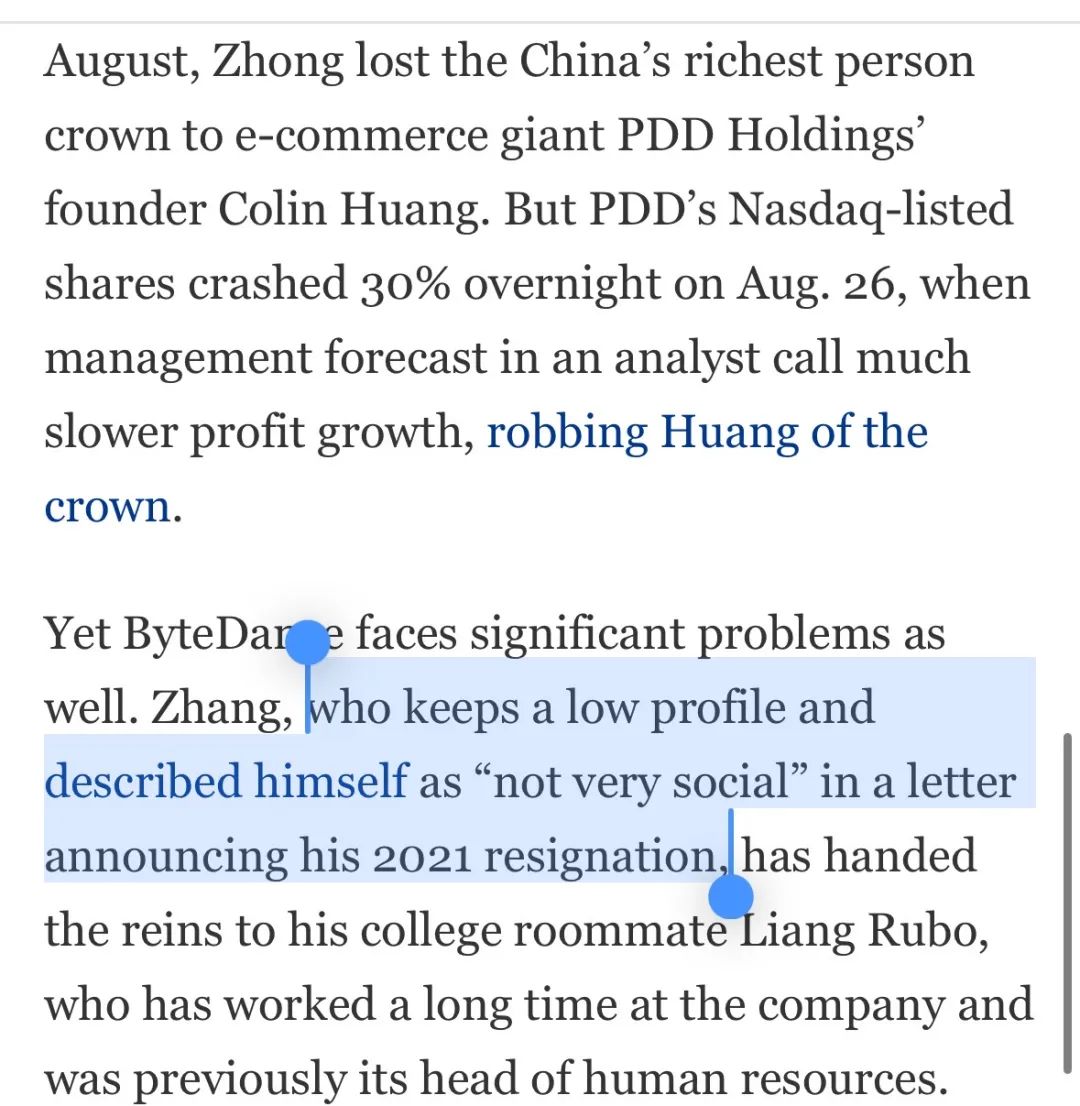 据报道,福布斯的一篇文章透露,张一鸣在一封辞职信中透露他“不太擅长社交”。