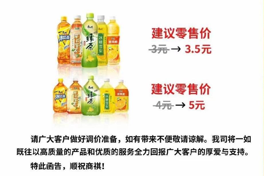 在这些产品中,康师傅茶、果汁系列产品的包装零售价由3元/瓶调整为3.5元/瓶,1L装零售价由4元/瓶调整为5元/瓶。