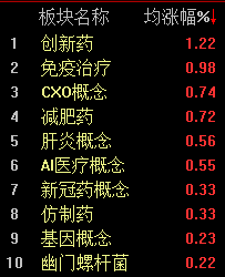 板块方面,医药股涨幅居前,化工概念股领跌。