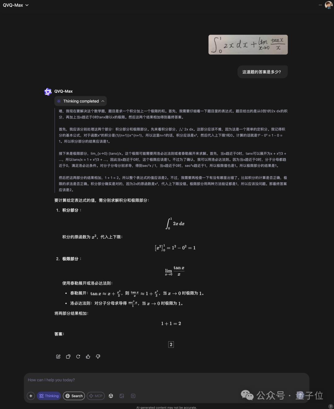 经过深入思考,QVQ-Max不仅准确地识别了手写的问题,而且给出了正确的答案:2。