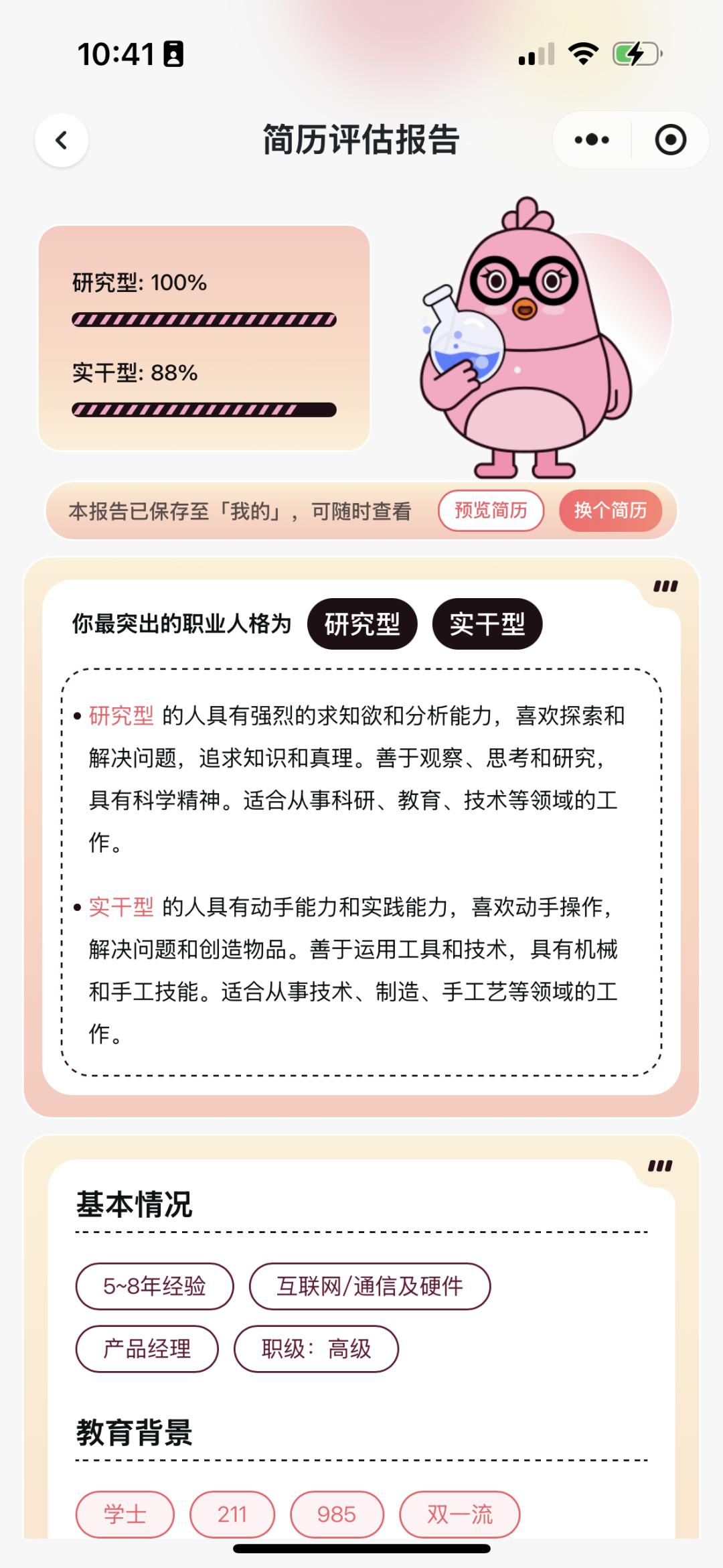 先在简历中分析一下你的「职业人格」类型,模拟是看到简历后HR的第一印象。