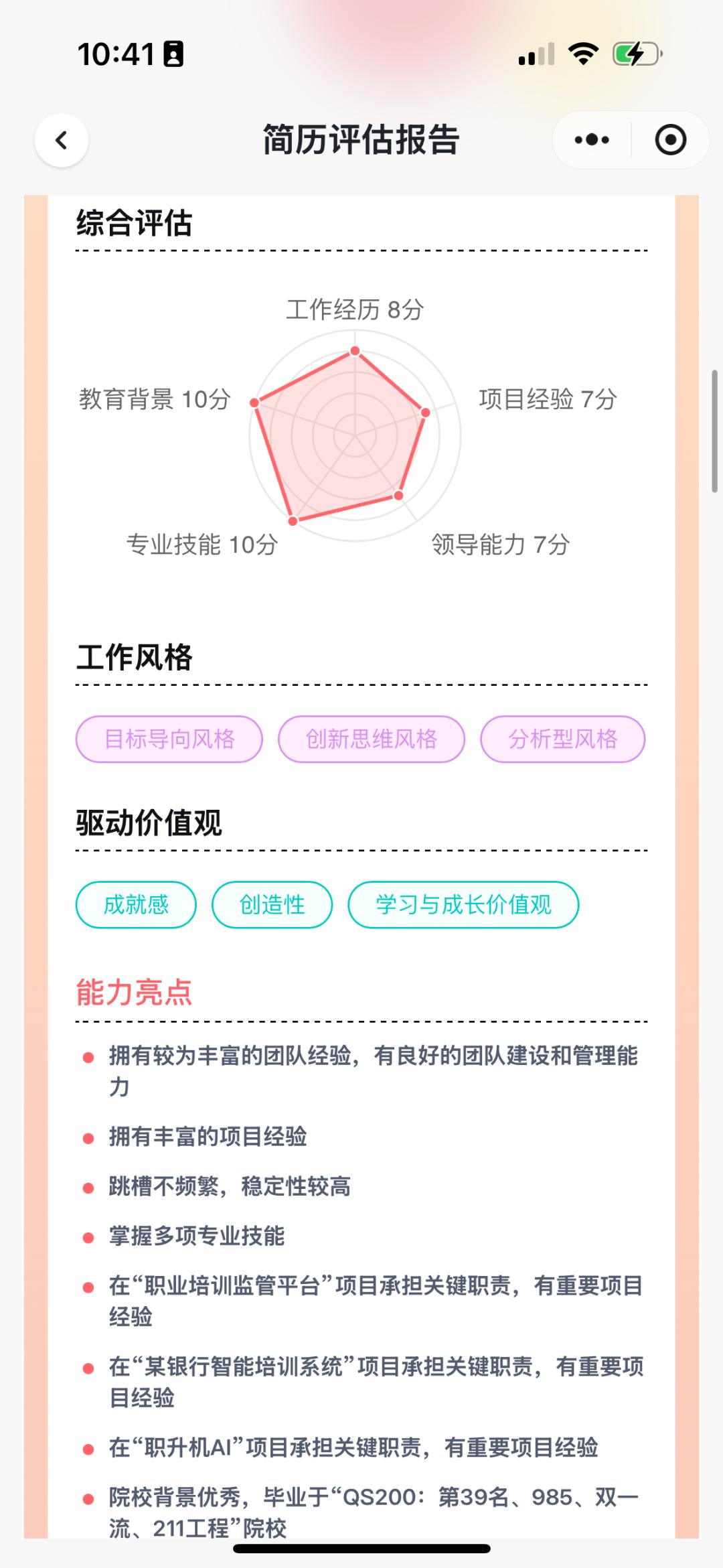 大约15-30秒后,生成一份简历分析报告。在此,建议不要写太长的简历,以免写得太长。一般一页简历最佳。