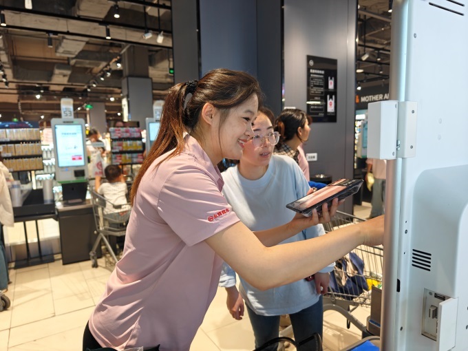 走进超市,首先感受到的是店铺氛围的不同。装修风格以低饱和度的灰色为主,灯光聚焦商品,降低到1.6米的货架高度也让视觉上更加舒适宽敞;现场热闹不仅不拥挤,店铺还拓展了购物渠道,将强制动线改为开放式动线。客户可以在任何区域选择好的产品,然后直接快速到达收银区。