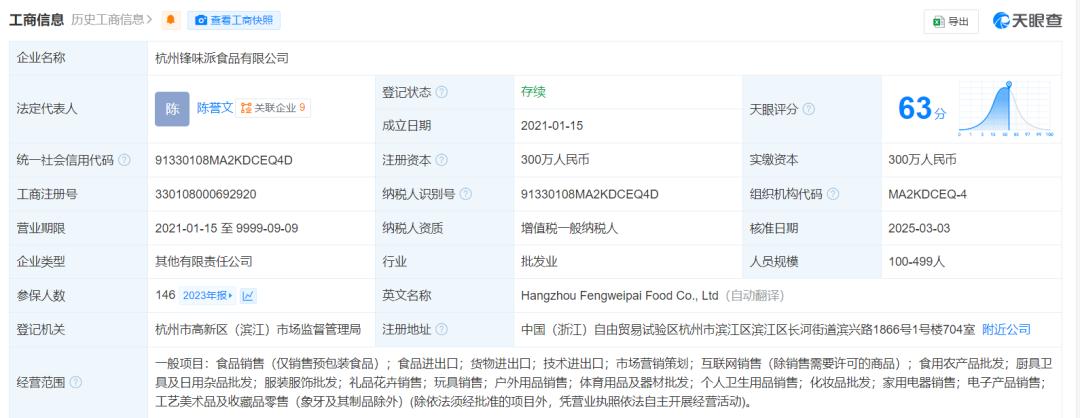 天眼查显示,杭州锋威派食品有限公司成立于2021年1月,法定代表人为陈誉文,注册资本300万元,经营范围包括食品销售、食品进出口、营销策划、网络销售等。股东信息显示,该公司由杭州谦道电子商务有限公司、丰威(北京)食品技术有限公司、北京菲猎电子商务有限公司共同持有。