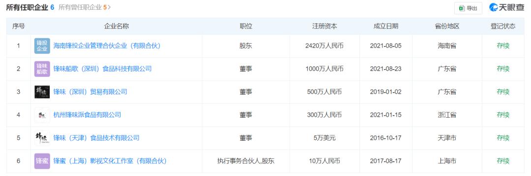 在这些公司中,董事长是薇娅的丈夫董海峰,谢霆锋是董事。