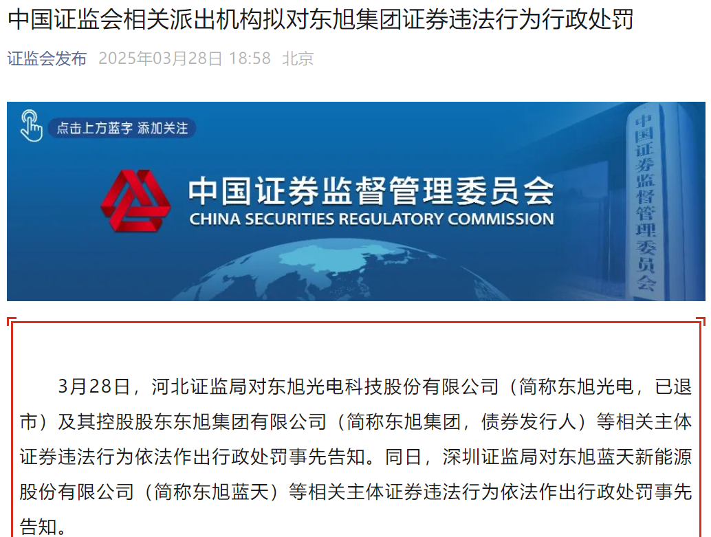 今天,河北证监局提前告知徐东光电科技有限公司(以下简称“徐东光电”,已退市)及其控股股东徐东集团有限公司(以下简称“徐东集团”、债券发行人)等相关主体证券违法行为。同日,深圳证监局提前告知徐东蓝天新能源有限公司(以下简称“徐东蓝天”)等相关主体证券违法行为。