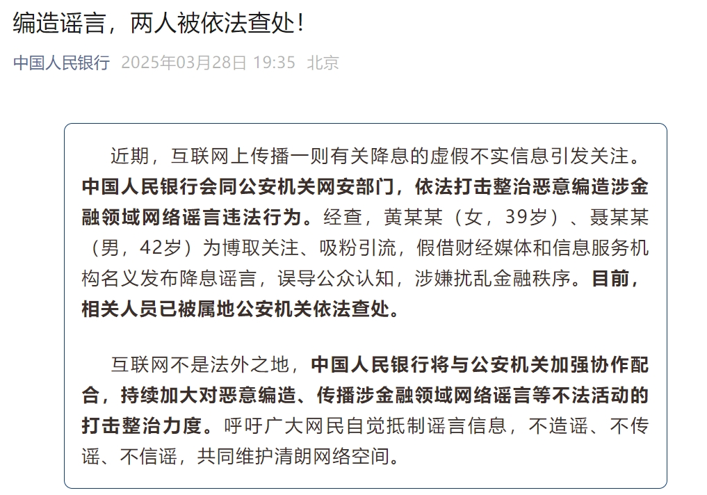 央行:两人为了获得关注,吸粉引流,编造降息谣言,被公安机关查处。