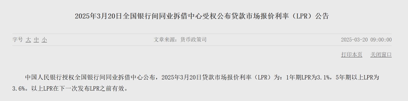 三月二十日,中国人民银行授权全国银行间同业拆借中心公布,2025年三月二十日贷款市场报价利率(LPR)为:LPR1年为3.10%,LPR5年以上为3.60%,均与前期保持一致。上述LPR在下一次发布LPR之前是有效的。