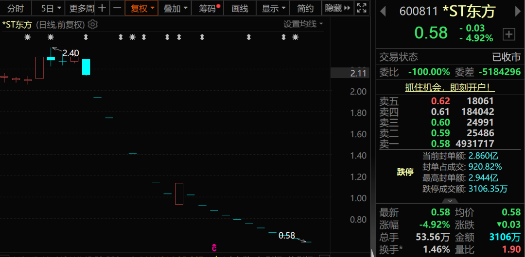 *ST东方(600811)宣布,由于触及重大违法强制退市和面值退市红线,该公司的股票可能因股价低于1元而终止上市。*ST东方于1994年上市。截至去年第三季度末,该公司注册股东数量约为12.9万,公司实际控制人为张宏伟。