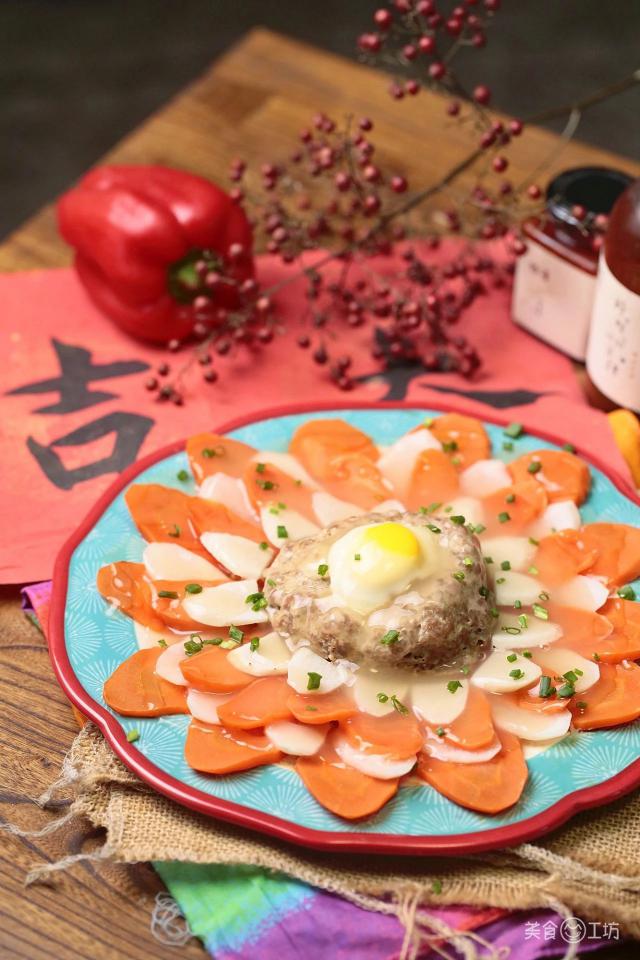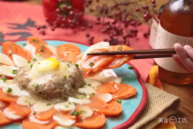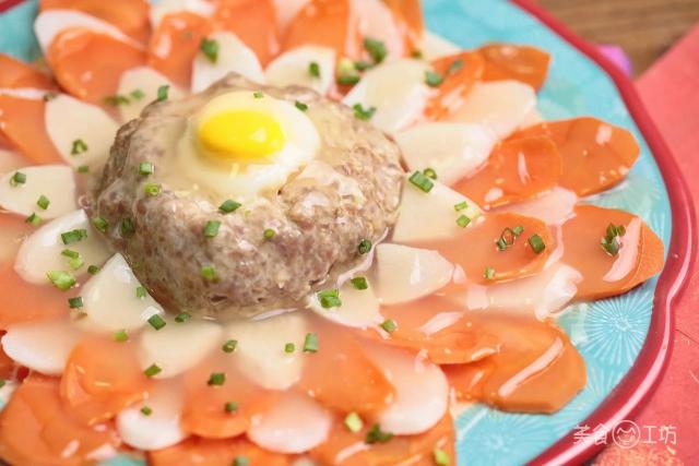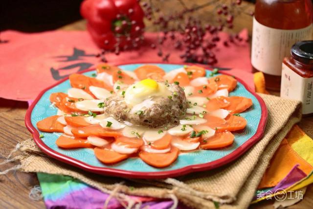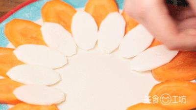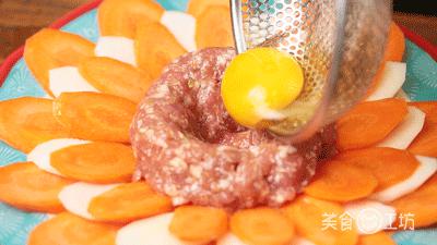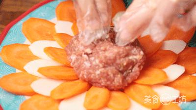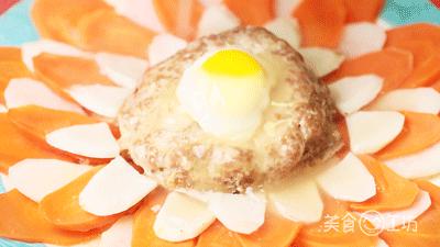 3. 把胡萝卜、山药片放在盘子里,把花瓣的样子重叠起来,然后把肉沫放在中间,做一个可以容纳鸡蛋的小孔。