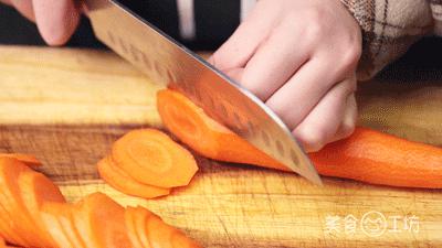 2. 胡萝卜,山药去皮,切成均匀厚度的片子。(山药切好后可浸泡在水中,滴少量白醋,放入氧化物中)