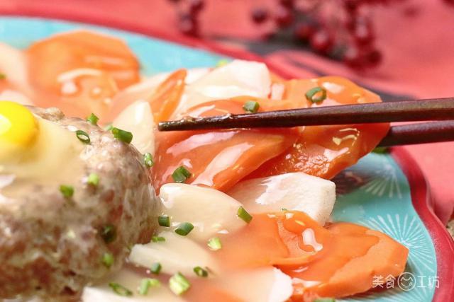 虽然是简单的调料,但是可以更好的刺激蔬菜的美味。蒸山药片和胡萝卜片用浓稠的酱料包裹,一点盐味可以凸显蔬菜的美味。