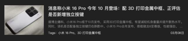 有人说下一代小米 16 Pro 同时也要加大力度,引进「3D 打印金属中框」。