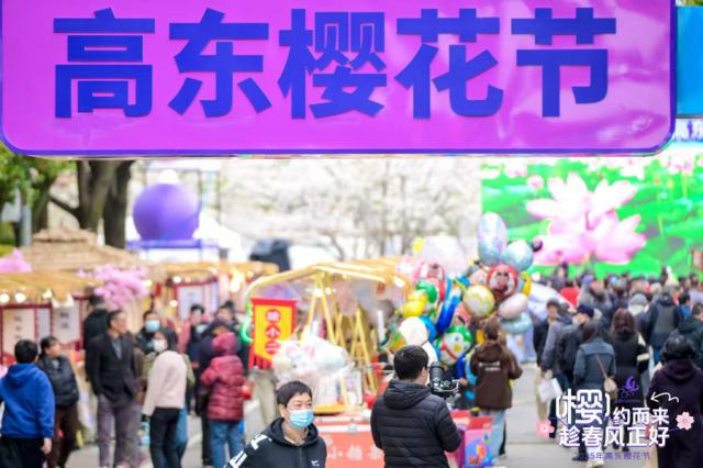 ""樱花"约而来,趁清风正好" 2025 2008年高东樱花节昨天在高东二路樱花园广场开幕。无论是团体文化巡展、门球嘉年华、文化创意美食市场、樱花文化旅游专线,无论是公司展览、樱花直播间、樱花招聘会、樱花客厅,整个樱花节都是“可观、可游、可住、可购”的,努力“促进消费,扩大内需”,促进区域经济社会的高质量发展。