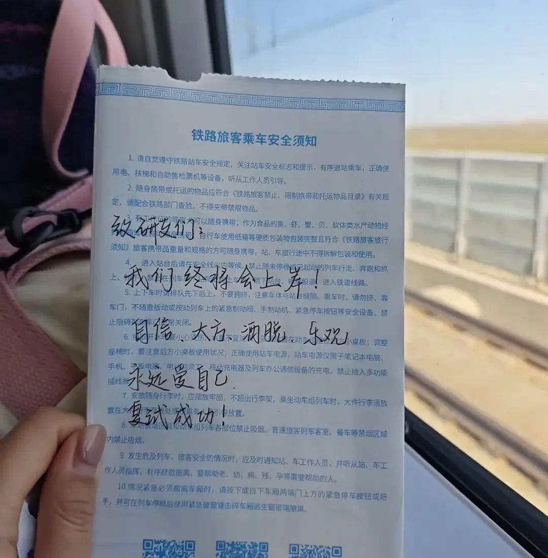 巧合的是,不久前,在北京西部的G1527列高铁上,网友们也发现了这样一封充满希望的信。信中的女孩期待着作为学生再次来到北京,探索美味的食物,尝试豆汁,转向她的梦想学校...