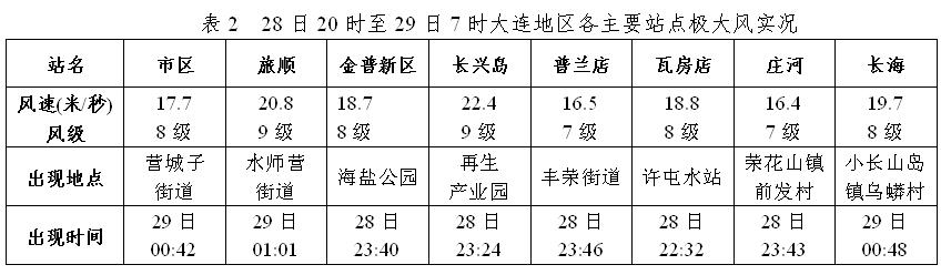 28日20时至29日7时,偏北阵风7时出现在大连近海、沿海地区和内陆。~9级,最大阵风为22.4米/秒(9级),出现在长兴岛经济区再生产业园(见表2)。