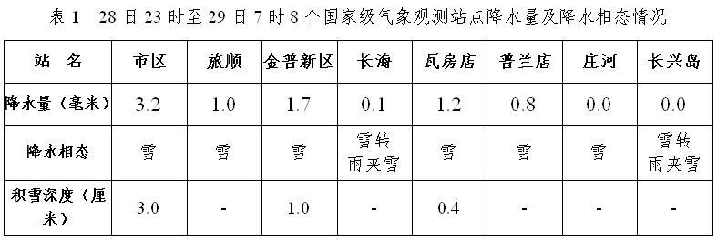 28日半夜,我市出现雨雪天,部分地区伴有雷击。各地降雨量为0.0~3.2mm。市区出现最大降水量(3.2mm)。截至29日7时,积雪深度为3.0厘米,金普新区为1.0厘米,瓦房店市场为0.4厘米,其他地区无积雪。8个国家气象观测站的降雨量和降雨量见表1。目前,降雨主体已经结束。