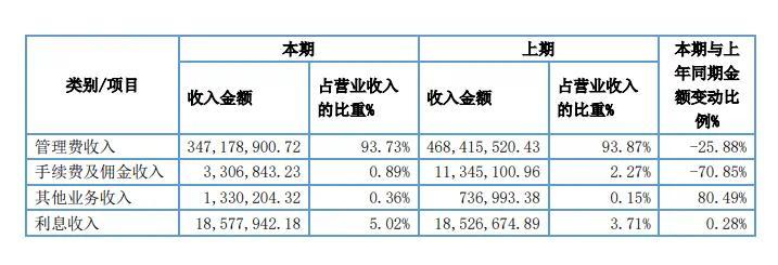 与2023年相比,中邮基金的管理费收入为3.47亿元,降低了25.88%。;手续费和佣金收入为330.68万元,比去年同期减少70.85%。