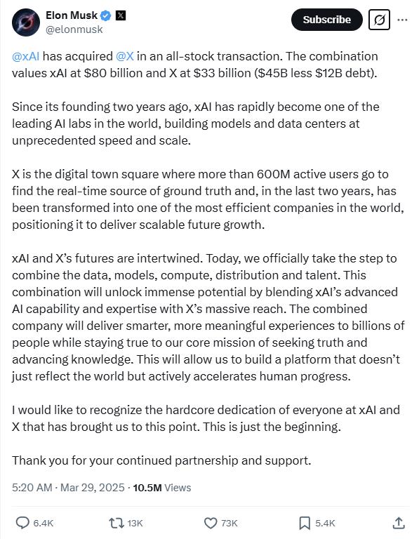 三月二十九日,埃隆·马斯克发文证实,其人工智能创业公司xAI已经与其社交平台X合并,交易形式为全股交易,使XAI的估值达到800亿美元,而X的估值达到330亿美元。
