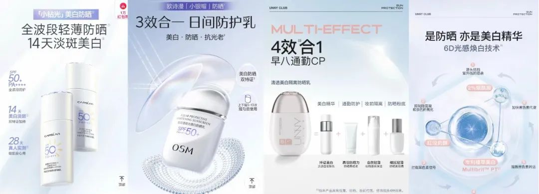 而且从目前的市场来看,UNNY CLUB悠宜、欧诗漫、卡姿兰等品牌都有“多效合一防晒霜”。例如UNNY CLUB悠宜的净透美白隔离防晒霜,声称“是防晒霜,也是美白精华”。