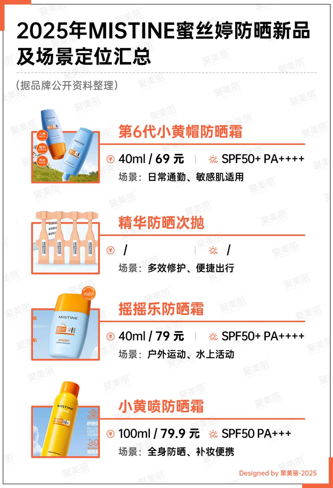 就品牌而言,许多防晒化妆品都在向不同场景的适应方向发展。例如,MISTINE蜜丝婷2025年新型防晒产品矩阵,也就是适应日常通勤,便携出行,户外活动等待不同的场景。