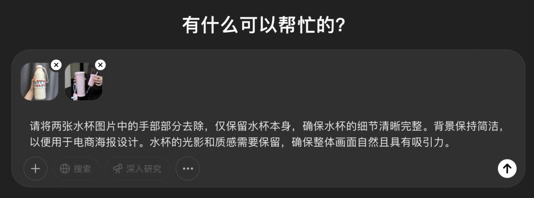 去掉双手,只留下杯子;保持杯子的细节、纹理和光影,自然看;背景要简单干净,突出杯子;两个杯子放在一起,比例要协调,画面要美观。还特别提醒它,尺寸应该是4。:3的。