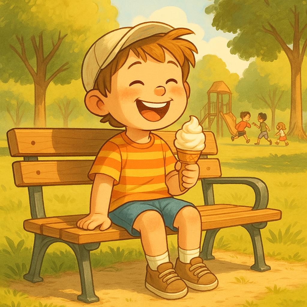 这是一个阳光明媚的下午,一个小男孩坐在公园的长椅上,手里拿着冰淇淋,脸上露出幸福的笑容。