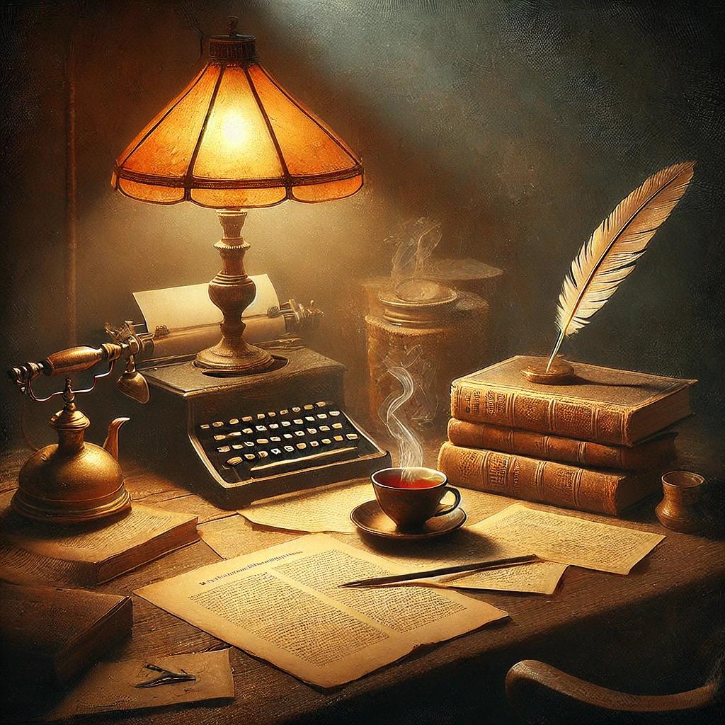 在黑暗的复古书房里,一盏台灯散发出柔和温暖的光线,照亮了一张古老的木制书桌。桌子上散落着几本黄色的书和一支羽毛笔,旁边是一杯热气腾腾的红茶。画面采用油画风格,营造出安静怀旧的氛围,仿佛时间在这里静止。