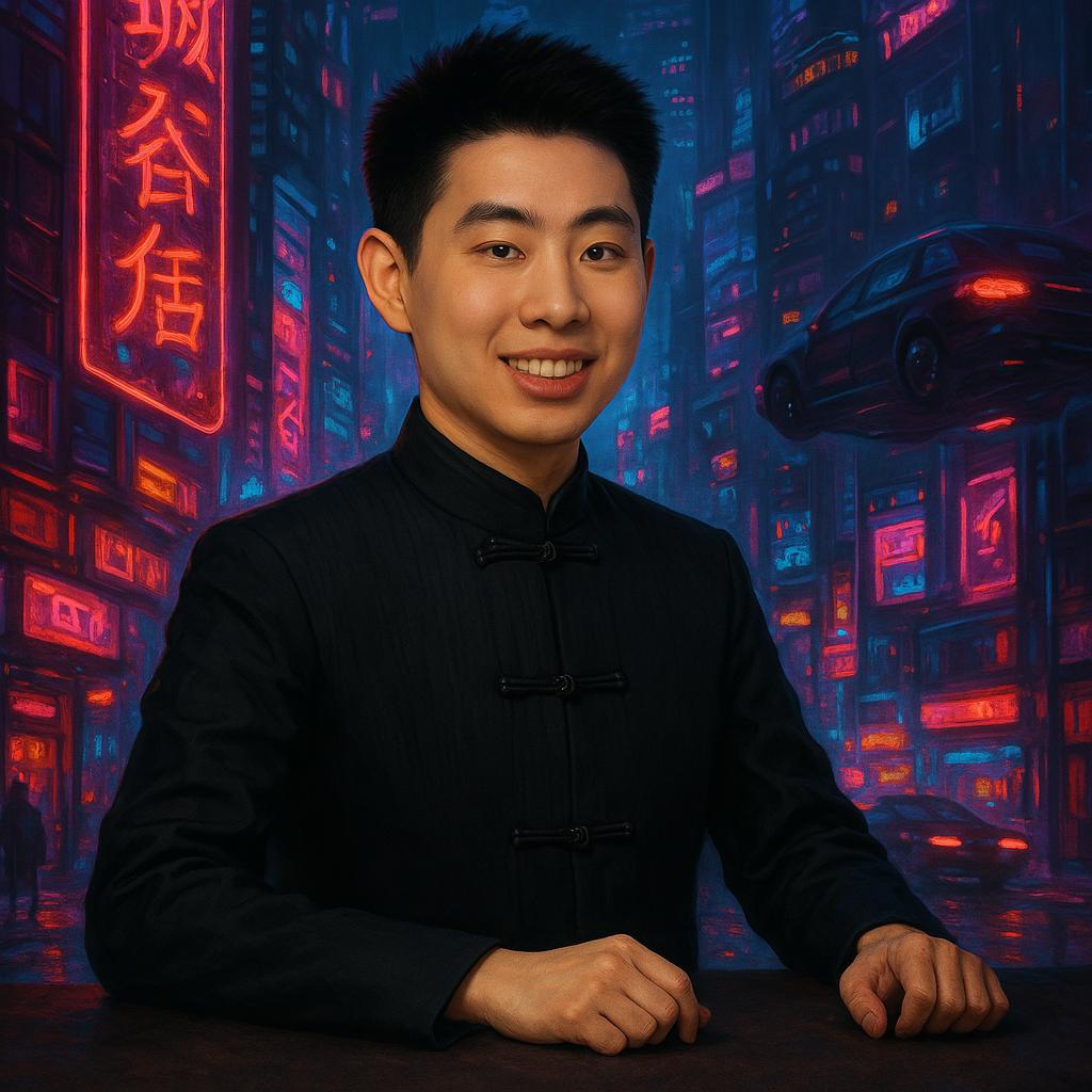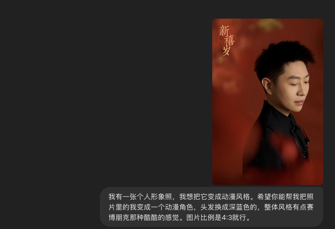 比如我有一张个人形象照片,我想把它变成一种动画风格。希望你能帮我把我变成照片里的动漫人物,把头发变成深蓝色,整体设计有点像赛博朋克。图片比例为4:3就行。