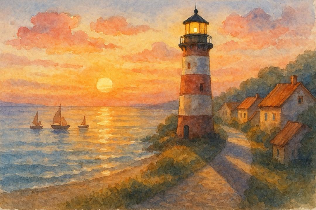 在一个宁静的海边小镇,夕阳的余晖洒在古老的灯塔上,灯塔的身影拉得很长。在远处的海面上,几艘船在金色的波浪中缓缓航行,几朵粉色的云漂浮在天空中。画面采用水彩画风格,色彩柔和温馨,营造出宁静梦幻的氛围。