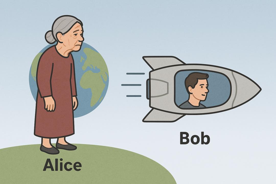 生成一张图片,展示两个人:Alice 在地球上,Bob 在高速飞行的太空飞船上。因为相对论的时间膨胀,Bob 看起来比 Alice 青春。在地球上 Alice 慢慢地变老,而飞船里的 Bob 几乎没有变化。背景简单,比例4:3。