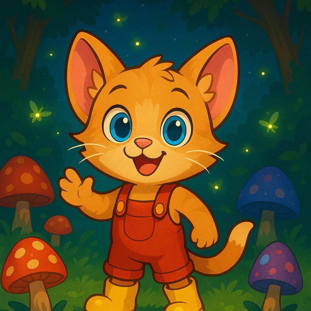 一只活泼可爱的卡通小猫,有着大大的蓝眼睛和柔软的粉色耳朵,穿着一条红色的小吊带裤,脚上穿着一双黄色的小靴子。