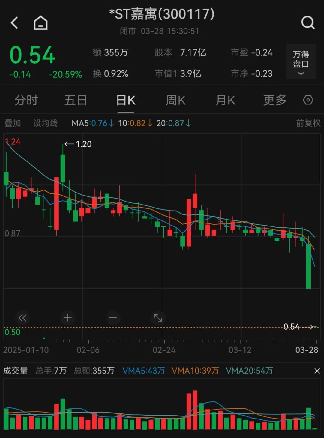 三月二十八日,*ST嘉寓(300117)一字跌停,公司股价为0.54元/股,最新市值不足4亿元。