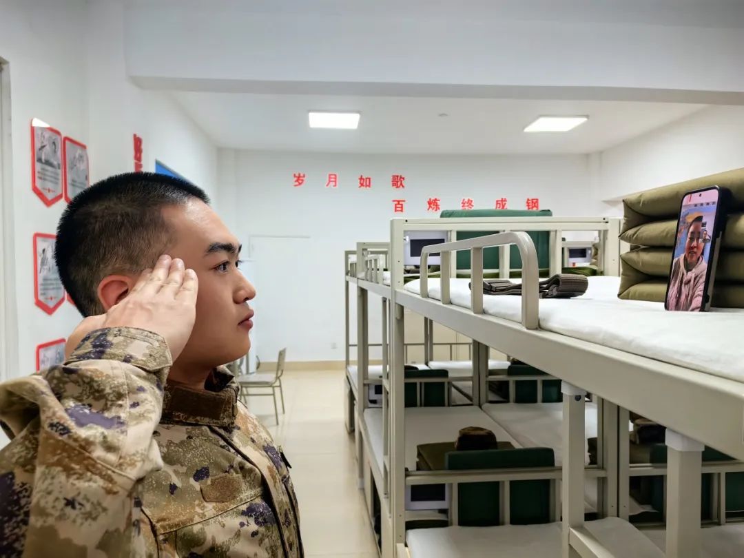晚饭后,新兵向家人报告平安。新兵袁林港对着手机,敬了一份标准的军礼,“爸妈,大家放心,我在这里很好!”