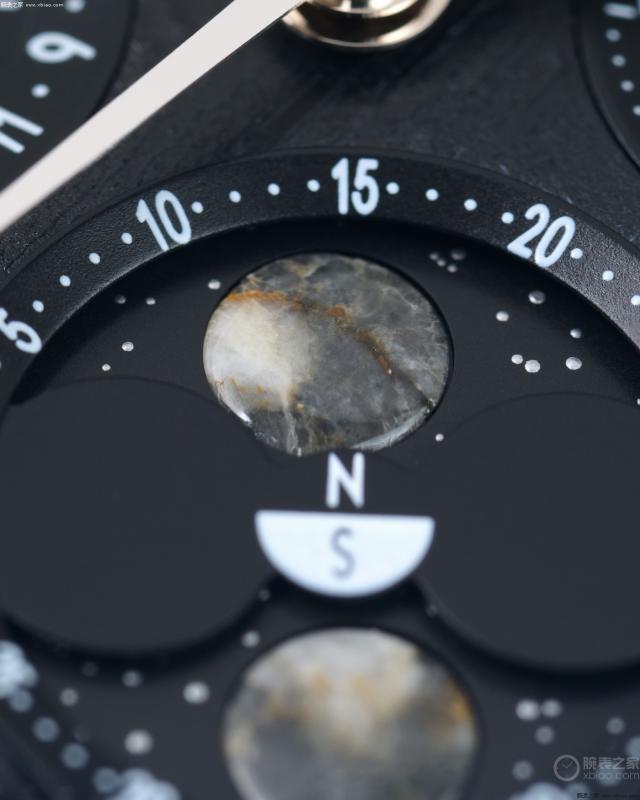 真正的绅士,从来不满足于浮华的外表,而是追求与时间产生共鸣的深度。月球陨石是超霸月相表的设计核心,未来来自 38 一万公里外的星体残片凝练成表盘的艺术语言——手表表盘采用陨石制作,然后经过 PVD 技术处理为黑色,组合为白色。 18K 金制时针 / 分针和小时刻度。两个黑色小表盘上的指针也是白色的。 18K 金制成。