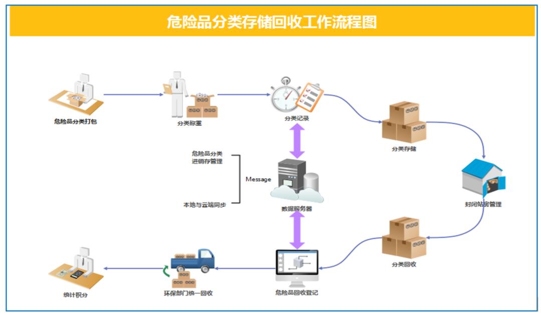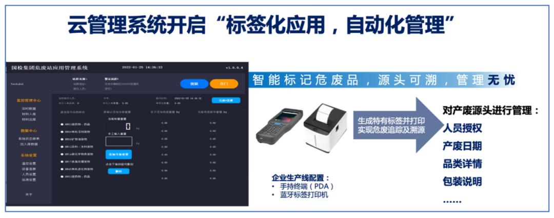 其中,“云管理”是该设施和系统的核心要点。通过云管理系统,用户只需在设施中选择手持终端和蓝牙标签打印机进行“扫码”,即可生成专属标签,完成人员授权、生产废物日期和类别详情的记录,从而对危险废物的生产、收集、储存、处理和利用等核心环节进行全程信息化跟踪管理,使危险废物从仓储到回收。完成源能查,去向可追。