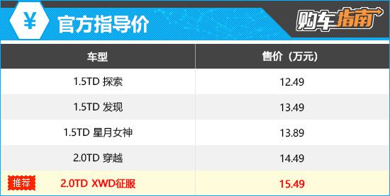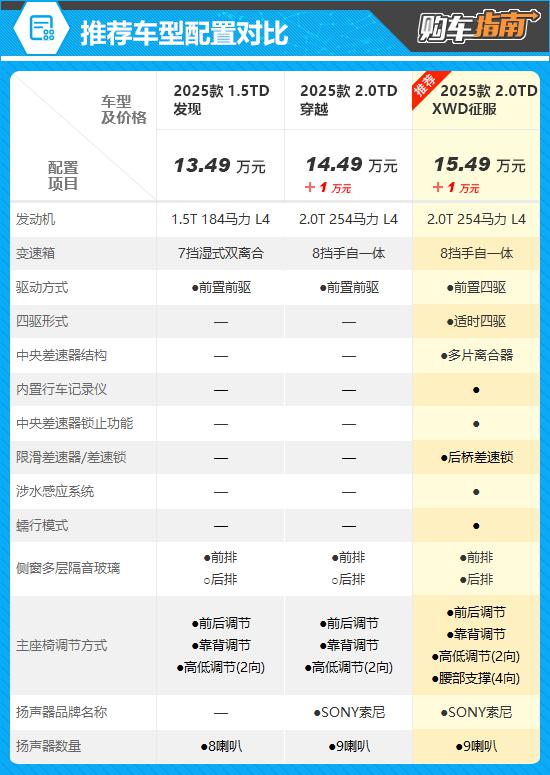 两款搭载 2.0T 毫无疑问,发动机车型更值得考虑。相比之下,编辑更推荐顶配。 2.0TD XWD 吸引力,价格比较 2.0TD 穿越只是昂贵的 1 一万元,但增强了博格华纳四轮驱动系统、后轮轴差速锁、内置行车记录仪、后侧窗多层隔音玻璃、驾驶座 4 调整腰部支撑等配置,并支持“ 7 X “性能模式,适应更复杂的车辆场景,也更适合轻越野。 SUV 定位。
