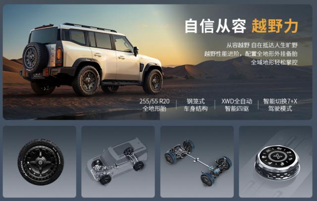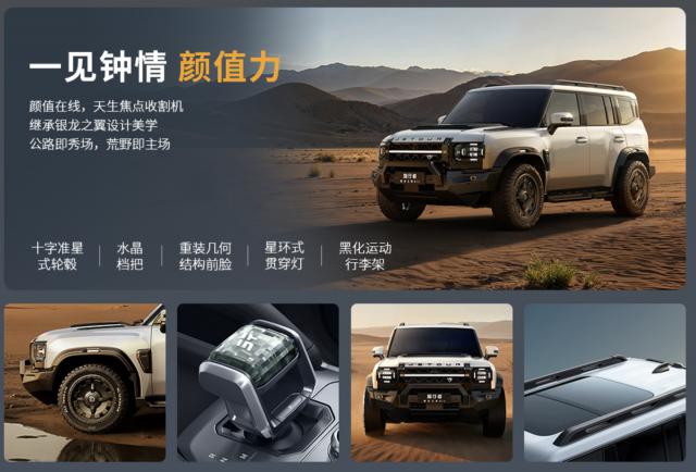外观方面,这款车的盒子造型持续,整体设计坚韧,整车采用银色。 / 黑色搭配,配备车顶行李架和全景天窗,车身包含固定的上车踏板,采用传统的门把手,车辆引入电吸尾门,并自带全地形外挂备胎。