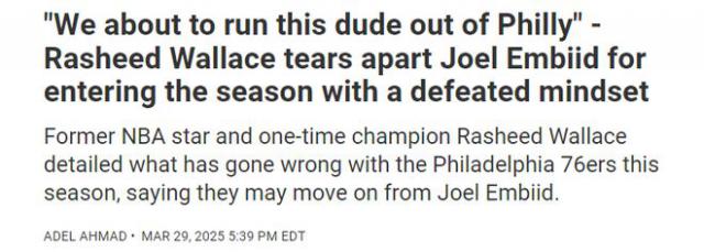 北京时间 3 月 30 日,NBA 官方社会媒体表示,如果 76 人们今天输了,他们将正式被淘汰,错过附加赛。76 今天,人们在主场迎战热火。被称为“咆哮天尊”的拉希德 - 华莱士在节目上吐槽 76 人们在这个赛季的表现,并且直言恩比德要被赶出费城。