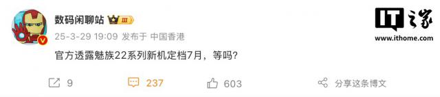 IT 世家 3 月 29 每日新闻,博主 @数码闲聊站 发帖称“官方透露魅族” 22 新机定档系列 7 “月”,但它还没有公布手机系列的具体规格信息。